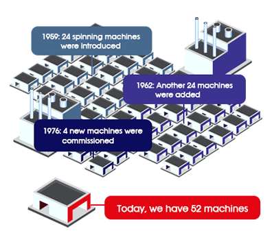 To meet ever-increasing demand, the company’s production capacity has grown from 7 metric tonnes per day in 1959 to 6,500 metric tonnes per annum today. With 52 machines in operation, Kesoram Rayon is ready to take on orders both large and small.